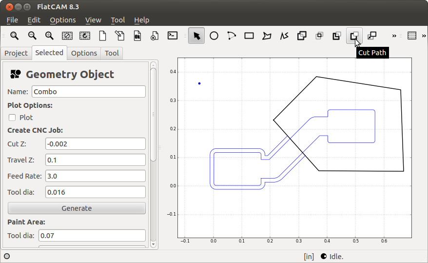 We want to select the isolation path to be the "target" and the forbidden polygon to be the "tool" for the Cut Path operation. For this, you just have to select them in that order. Then click on the Cut Path button. The result is shown below.