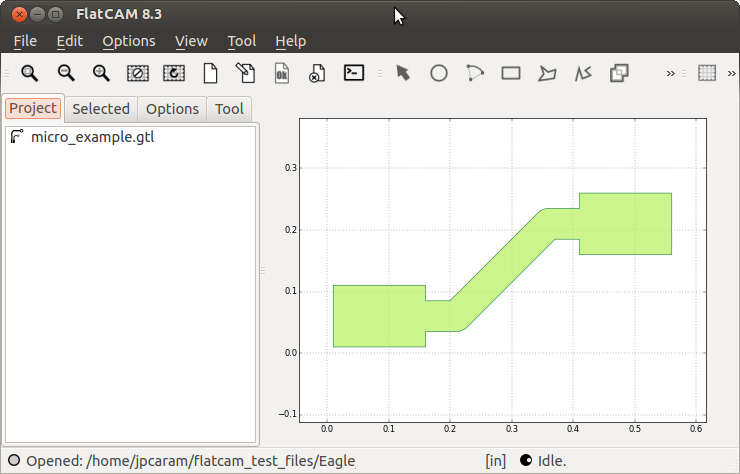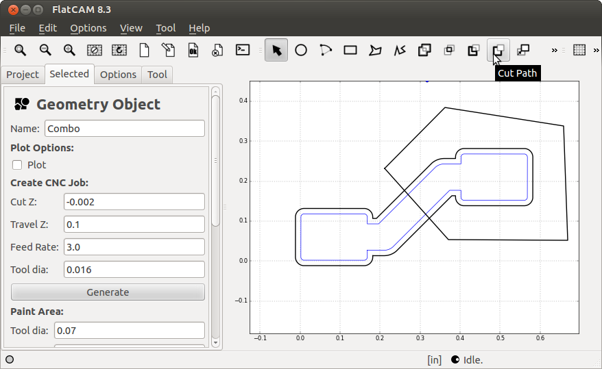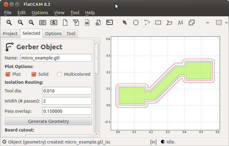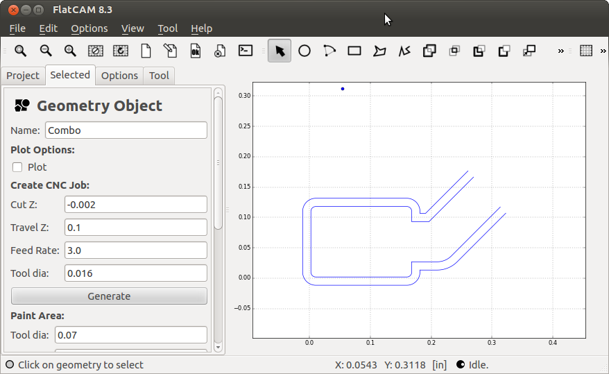 We have carried out a few steps to get here: The isolation routing operation from before created 2 geometry objects. We have joined them using Edit→Join Geometry and deleted the original 2 objects. Then we've hidden the plots for the Gerber and the "Combo" geometry.